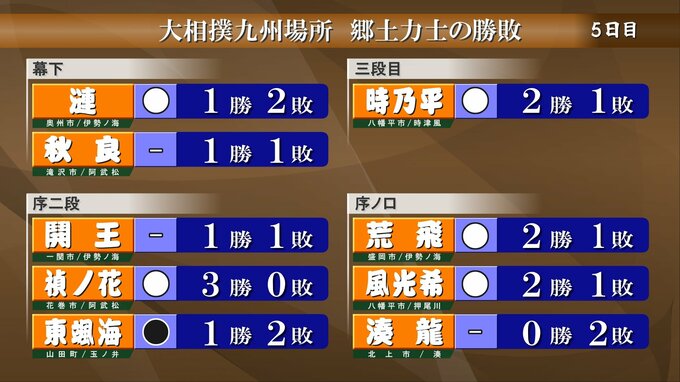 大相撲九州場所5日目、郷土力士の勝敗です。