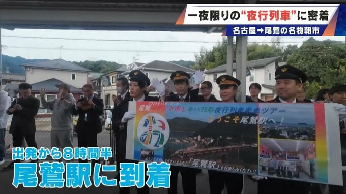 午前8時32分、出発から8時間半、ついに終点・尾鷲駅に到着。ホームでは地元の人たちが歓迎してくれました。尾鷲市が、この夜行列車を歓迎するのにはワケが。