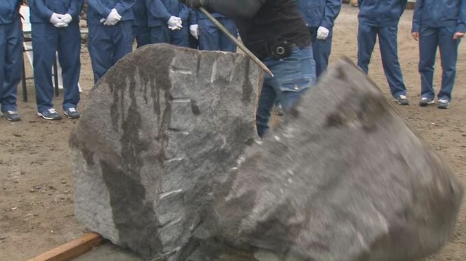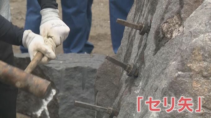 石工が岩に「セリ矢」と呼ばれる杭を打ち込んでいくと、大きな岩に亀裂が入り二つに割れました。