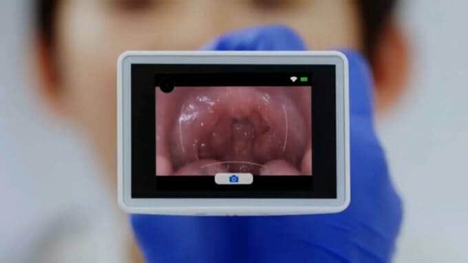 インフルエンザの検査といえば、鼻のなかに綿棒を押し込む「痛い検査」のイメージがありますが、こちらは患者の喉の写真を撮影し、患者の体温や症状などの診療情報も専用のサーバーに送ることで、AIがインフルエンザかどうかを判定。