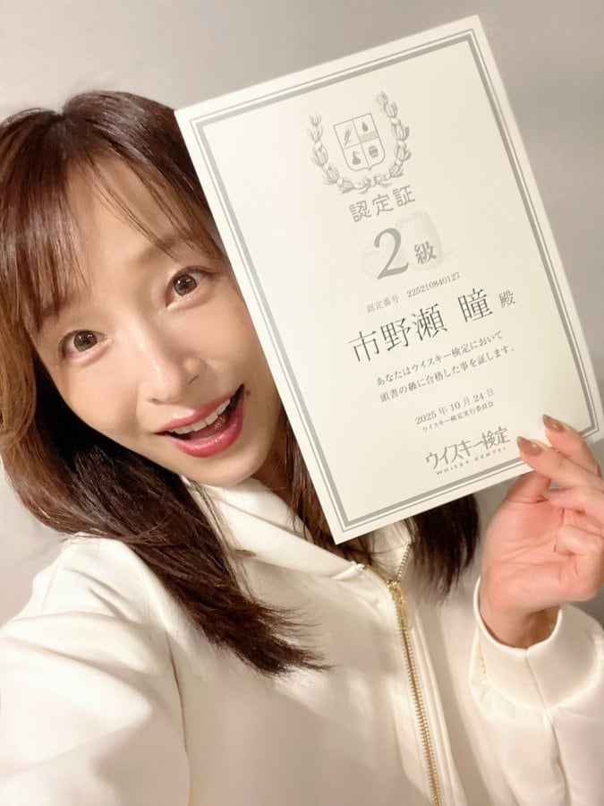 フリーアナウンサーの市野瀬瞳さんが、自身のXを更新。ウイスキー検定2級を取得したことを報告しました。