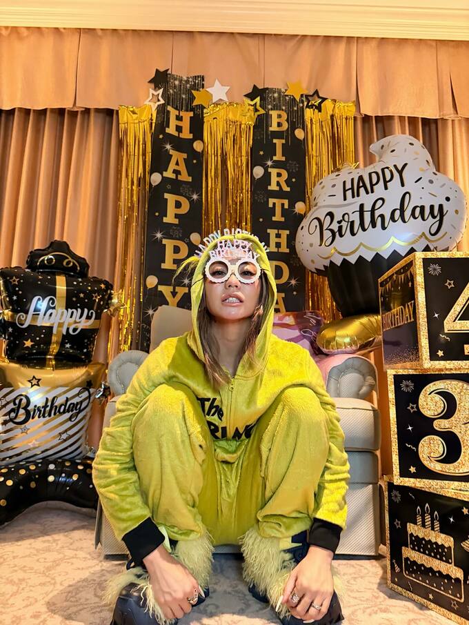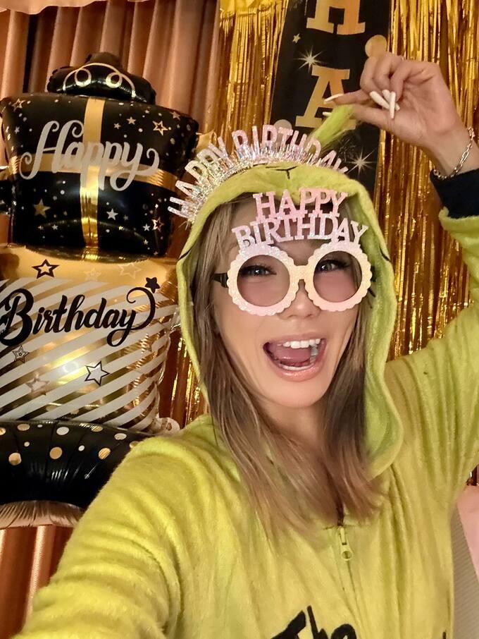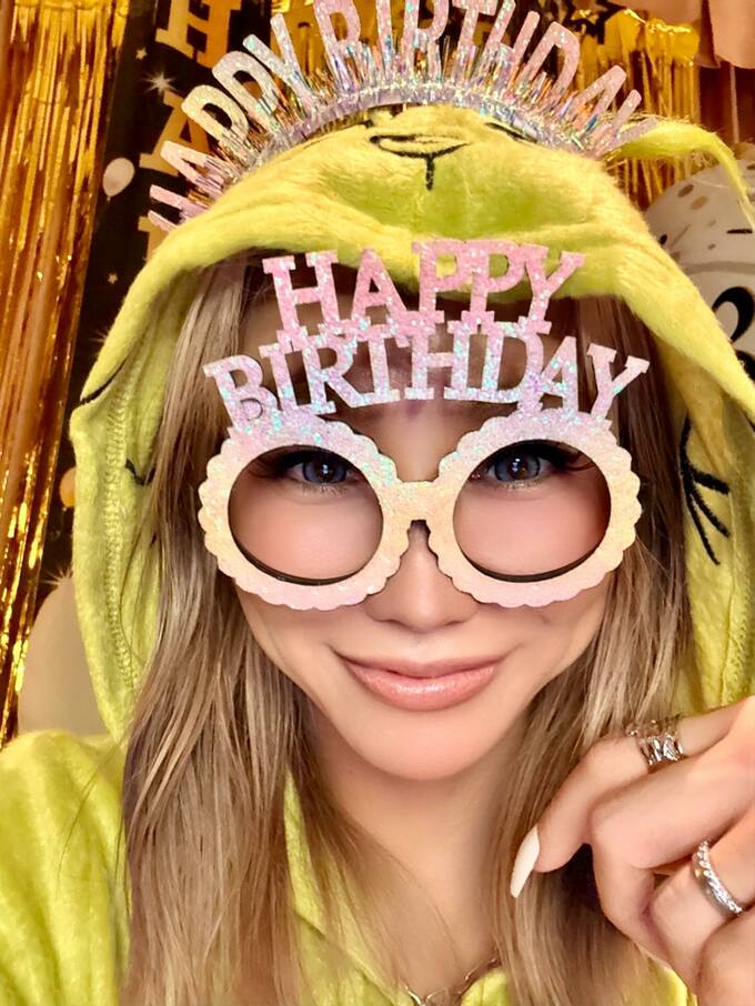 「HAPPY BIRTHDAY」と書かれた丸メガネや、王冠を身に着ける画像もあり、バースデーパーティーらしい遊び心あふれる装いです。