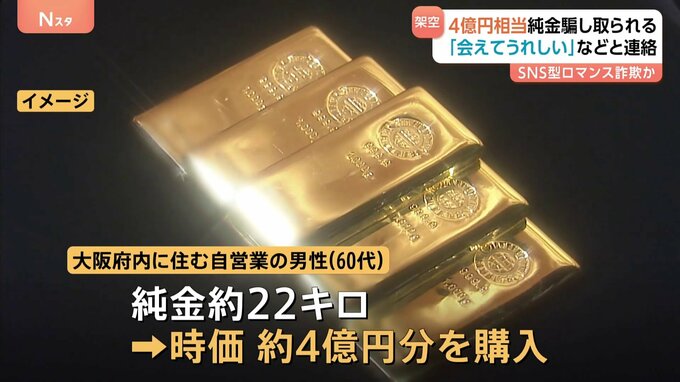 「あなたのような人に会えてうれしい」。SNS型ロマンス詐欺の手口で、4億円相当の純金がだまし取られました。警察によりますと、大阪府内に住む自営業の男性(60代)は今年7月、秋山桜子と名乗る人物からSNSを介し…