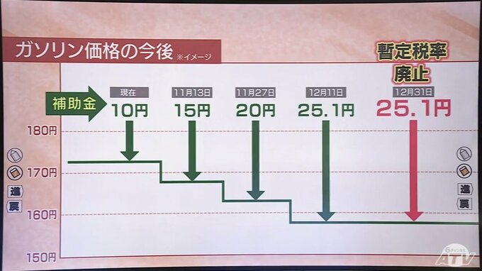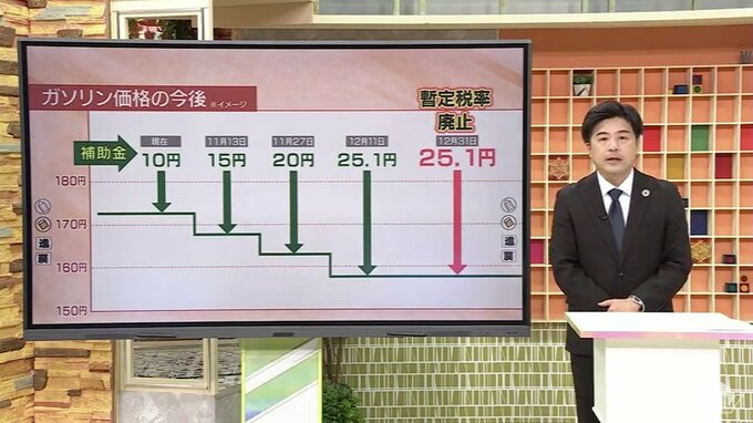 ガソリン価格は、与野党が12月末での暫定税率の廃止で合意していますが、政府は、急激な価格の変化が起きないよう2週間ごとに5円程度、石油元売り各社への補助金を引き上げていき、段階的に店頭価格が下がるようにしていきます。