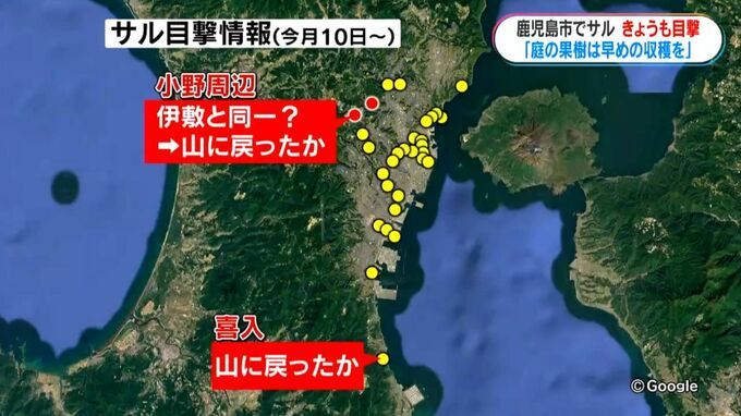 13日も鹿児島市ではサルが目撃されています。13日は午前中に、鹿児島市小野付近で目撃情報が2件寄せられています。