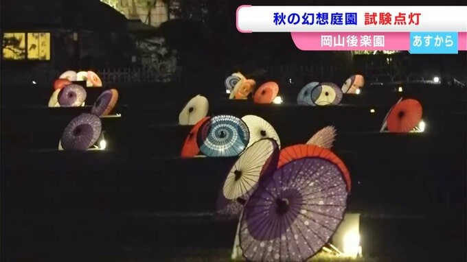 岡山市北区の後楽園を優美な明かりで彩る「秋の幻想庭園」。あす(14日)開幕するのを前に、きょう(13日)午後5時ごろから試験点灯が行われています。