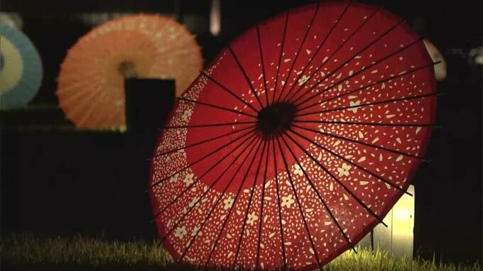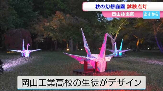 岡山工業高校の生徒がデザインした7体の鶴などが紅葉とともに照らされ、後楽園は昼とは違った幻想的な魅力に包まれています。
