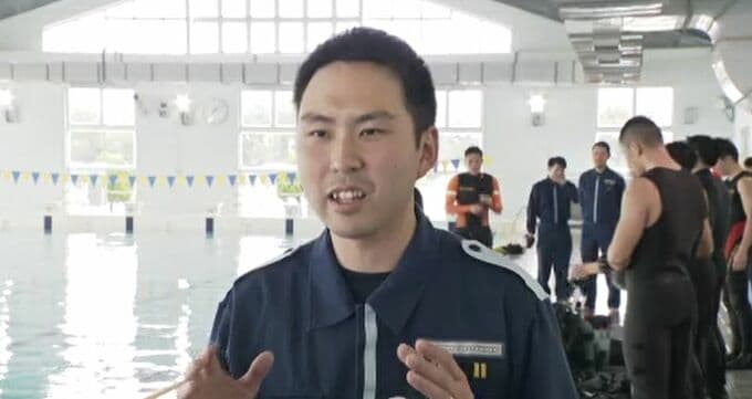 10キロの重りをお腹に乗せて仰向けで泳ぐ訓練では、互いに激が飛び交う中、体力の限界に挑戦します。