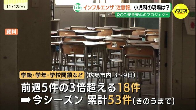 学校でも感染は広がっています。広島市内の学級閉鎖などは11月に入って急増していて、3日からの1週間では、その前の週の3倍を超える18件でした。今シーズンの累計は、12日までに53件にのぼっています。