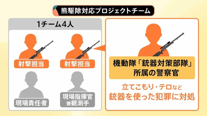 チーム名は「熊駆除対応プロジェクトチーム」です。射撃担当2人、現場責任者、現場指揮官兼観測手の1チーム4人で構成されています。
