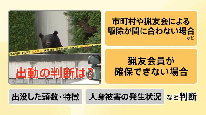出動のタイミングは、▼市町村や猟友会による駆除が間に合わない場合などや、▼猟友会員が確保できない場合だということです。