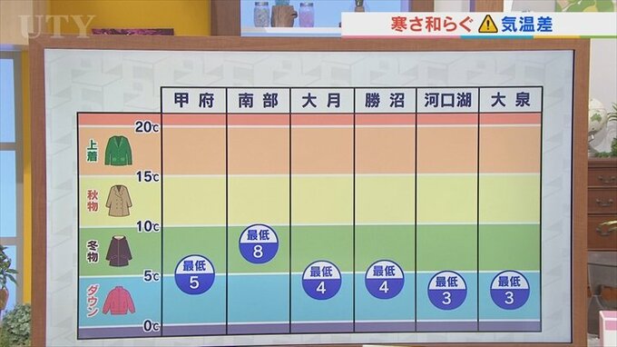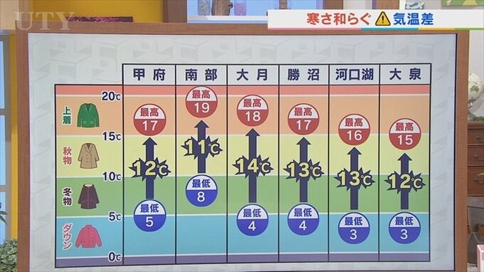 南部は19℃、甲府17℃、大月18℃で、昼間は薄手の上着で過ごせる体感となる見込みです。