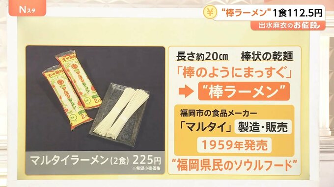 “棒ラーメン”と呼ばれる大人気の即席麺のお値段は1食112.5円となっています。2食入りで希望小売価格は225円。