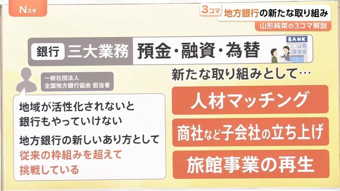 新たな取り組みとして、銀行が持つ情報網を活かした、▼人材マッチング、▼商社など子会社の立ち上げ、▼旅館事業の再生を行っているということです。