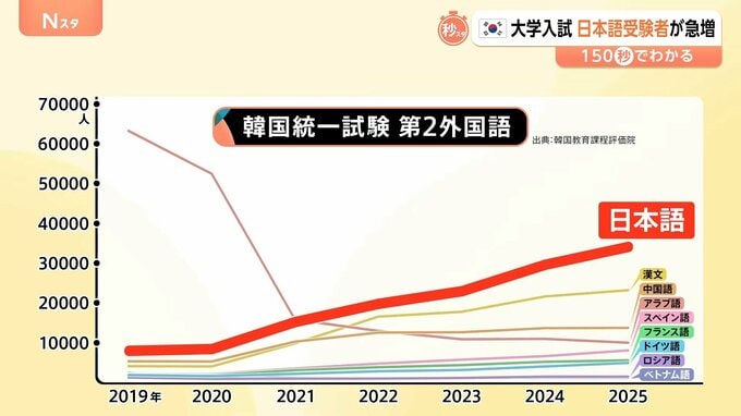 韓国教育課程評価院によると、日韓関係が最悪とも言われた2019年に比べると、受験者数は4倍以上に増加。