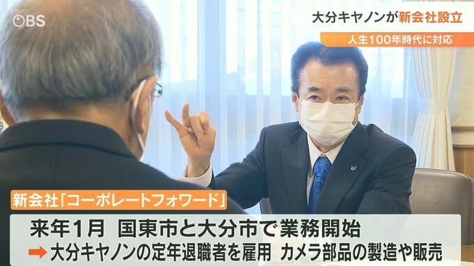 大分キヤノンは従業員が定年退職を迎えるのを期に、生涯就労を目指す新会社を設立し、12日、広瀬知事に報告しました。来年1月に国東市と大分市で業務を開始する新会社「コーポレートフォワード」は、大分キヤノン…