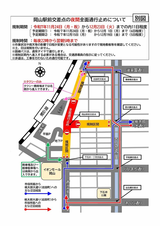 岡山駅前交差点が「夜間全面通行止め」に 11月24日~12月23日までの間で11日程度 「路面電車乗り入れ工事」に伴い【岡山】 RSK山陽放送 2025年11月14日(金) 09:42 国内 通行止め時の「う回路」は?画像をみる 【画像②】岡山市提供