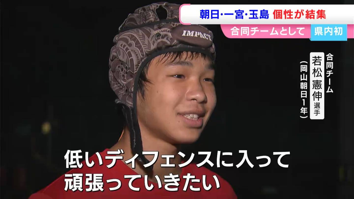 10人のうち9人が1年生、岡山朝日です。練習は選手主体、一人ひとりが頭脳プレーを得意としています。フランカーの若松選手は、164センチ、55キロの小柄な体格ながら、しぶとく鋭いタックルを繰り出すディフェンスの要です。