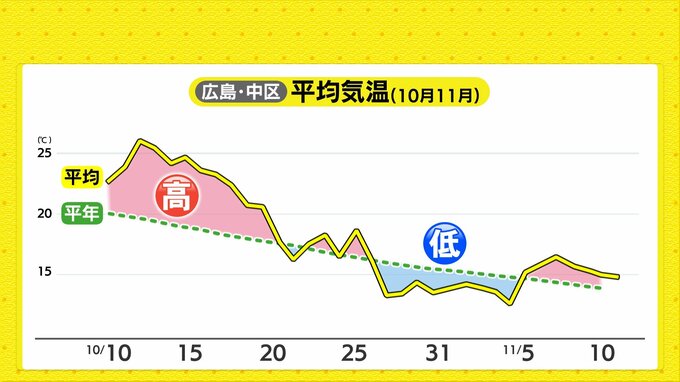 広島市中区の最高気温と平均気温の推移を見ると、最高気温・平均気温ともに10月下旬以降大きく下がり、10月末から11月頭にかけては、平均気温が15℃を下回り、平年を下回った時期もありました。短期間での気温の落差が大きくなりました。