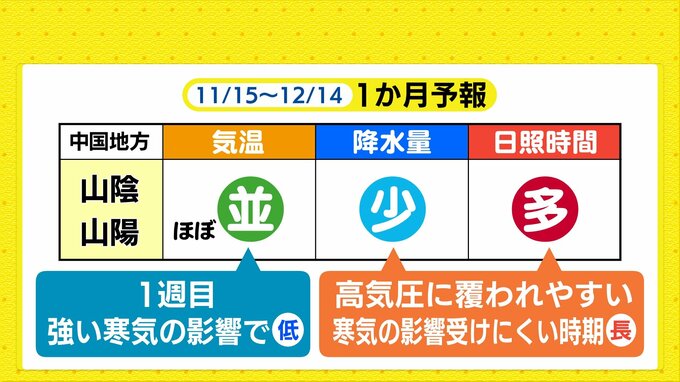 この先の見通しはどうなるのでしょうか。気象庁が発表している最新の1か月予報によりますと、中国地方の向こう1か月の気温はおおむね平年並の予想です。ただ、21日にかけての1週間の平均気温は平年より低い見込みです。17日以降は冬型の気圧配置になり、一時的に上空に強い寒気が流れ込むため、各地で12月並の冬の寒さが到来する見込みです。冬用タイヤへの履き替えなど、早めの冬支度をお願いします。ただ強い寒気の流れ込みは一時的で、28日にかけての1週間は気温が平年並か高い予想 12月12日にかけてはおおむね平年並となる予想です。日ごとの寒暖差が大きい予想ですので、体調管理には十分ご注意ください。