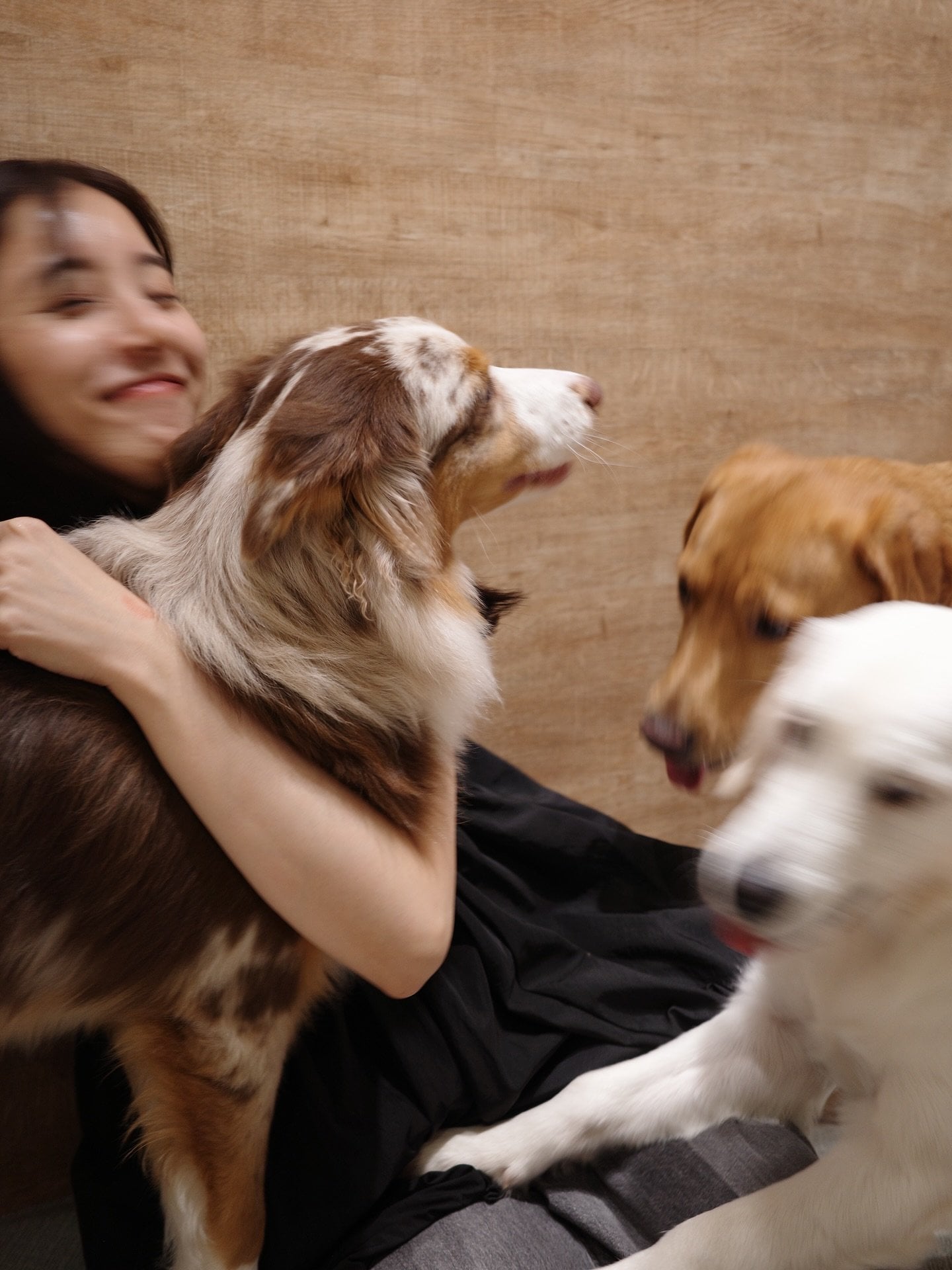中には、2匹の犬と新木さんが並んでポーズを決める記念写真のような写真や、3匹の犬にもみくちゃにされる新木優子さんの姿も。