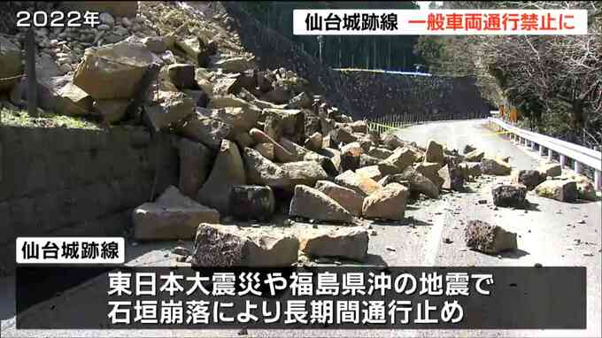 仙台城跡線は東日本大震災や2022年の福島県沖の地震で仙台城の石垣が崩落して長期間通行止めとなっていました。