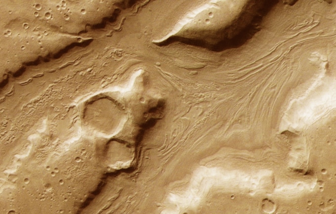 これらの模様は「線状谷埋積物」(谷の中)や「同心円状クレーター埋積物」(クレーター内)と呼ばれ、かつて氷河が火星表面をゆっくりと流れた証拠です。