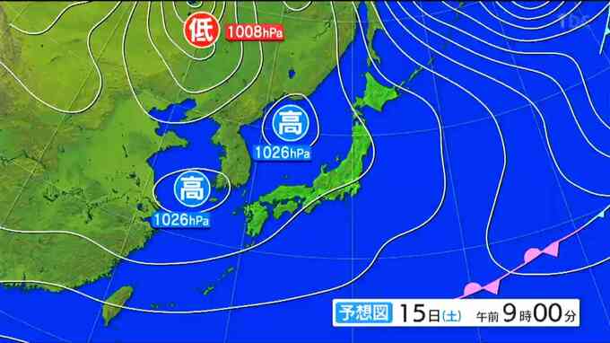 15日(土)午前9時の予想天気図では、冬型の気圧配置が緩み、高気圧に覆われる見通しです。