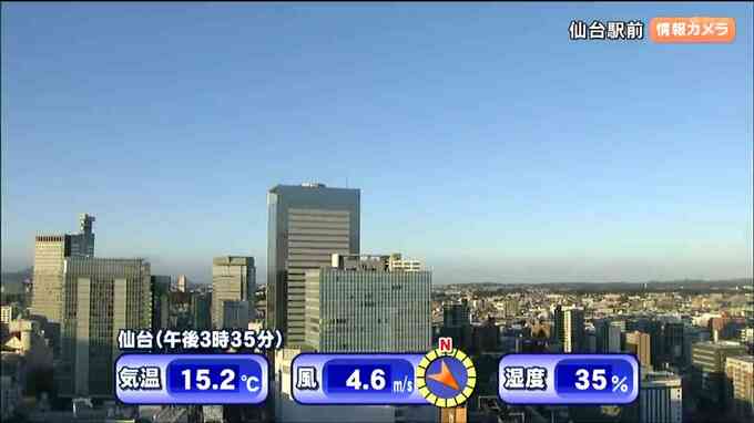11月14日午後3時35分時点の仙台市内の観測データによると、気温は15.2℃、風速4.6m/s、湿度35%を記録しています。