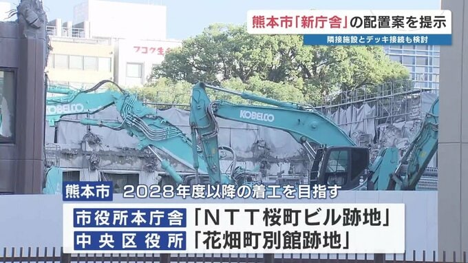 庁舎の建て替えを計画している熊本市は、市役所本庁舎を「NTT桜町ビル跡地」に、中央区役所を「花畑町別館跡地」に場所を移して建てる方針で、2028年度以降の着工を目指しています。