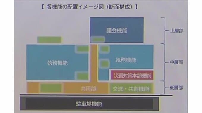案では現在、本庁舎とは別の棟にある議会を上層部に置き、各部署の執務スペースと災害対策本部は中層部に、市民が交流するスペースなどを低層部に配置する計画です。