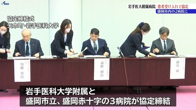 14日は岩手医大附属病院の森野禎浩院長が、盛岡市立病院と盛岡赤十字病院の院長とそれぞれ協定書にサインしました。