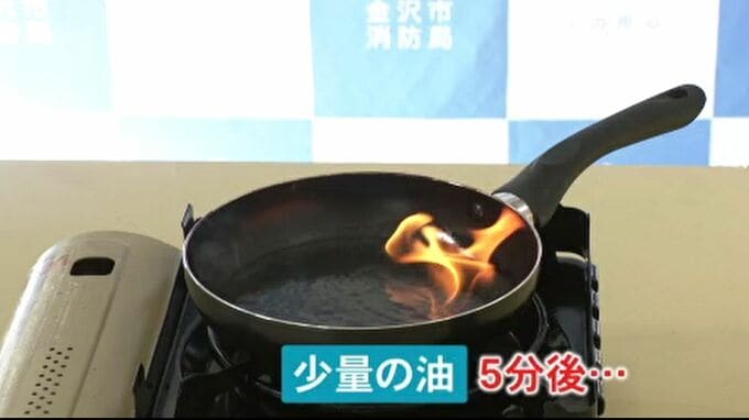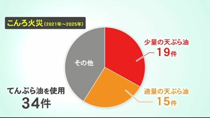 金沢市内で過去5年間に発生したこんろ火災うち、てんぷら油を使っていたケースは34件あり、その半分以上の19件は適量よりも少ない油で調理していました。