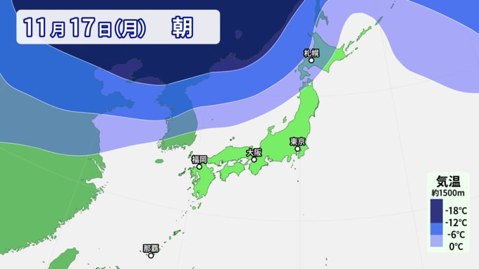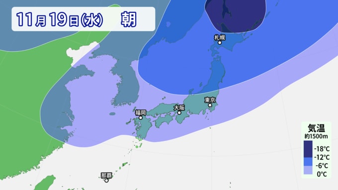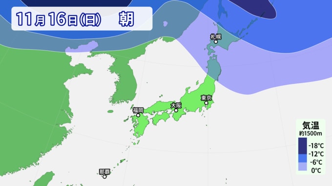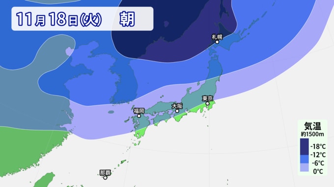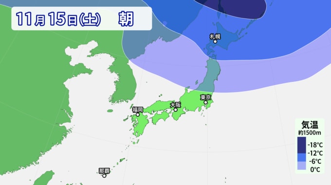 また、山で雪が降る目安となる【上空1500m・0℃以下】の寒気が、九州まですっぽり覆う見込みです。
