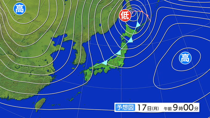 17日月曜日は、発達する低気圧の影響で、北海道は雪や風が強まり、今シーズン初の「冬の嵐」となりそうです。