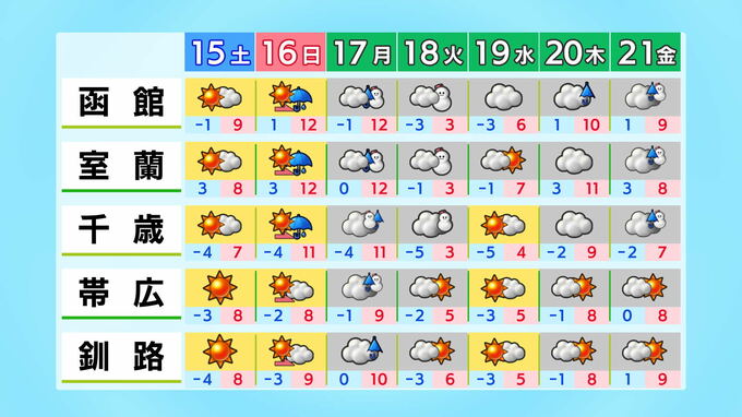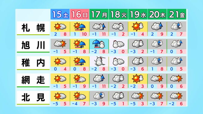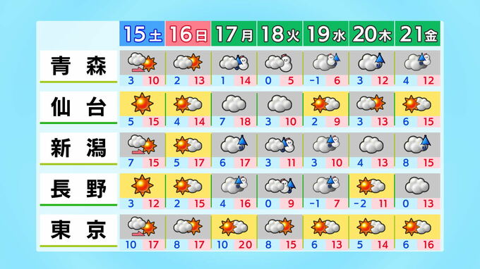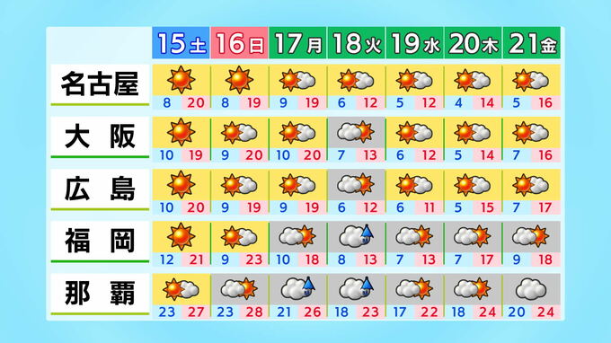 また、寒さも厳しくなり、18日の最高気温は札幌2度、大阪や福岡は13度、東京15度など12月並みの地域が多くなりそうです。