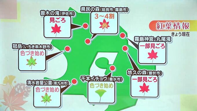 ▽いちき串木野市の冠岳と垂水千本イチョウは「色づき始め」