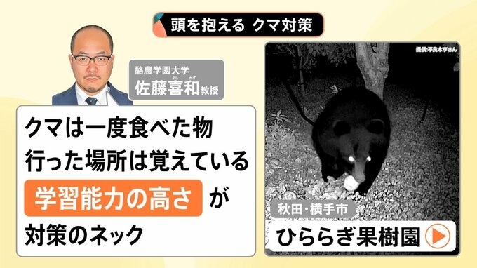 クマ対策の難しさについて、酪農学園大学の佐藤喜和教授は「クマは一度食べた物、行った場所は覚えている。学習能力の高さが非常にネック」だとしています。