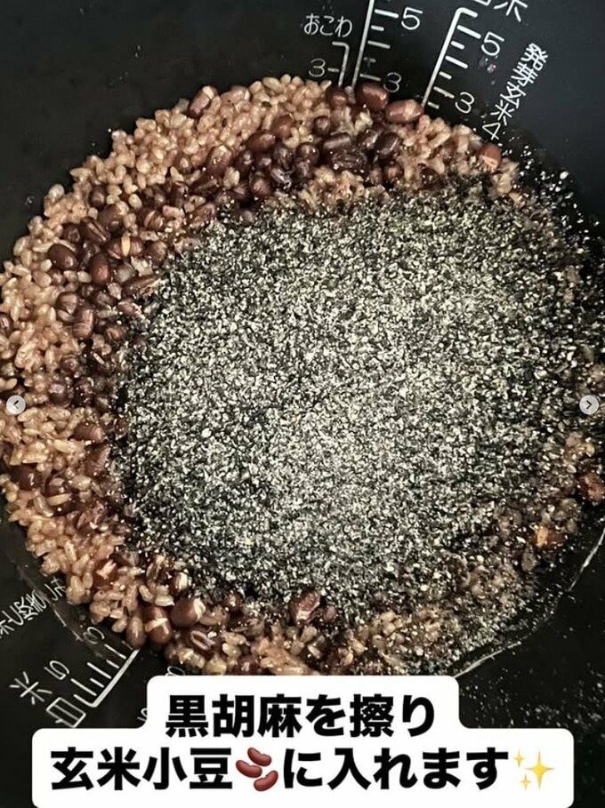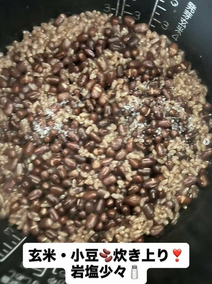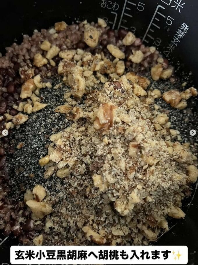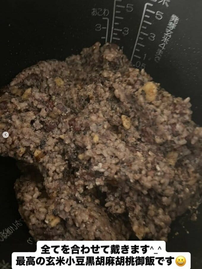 最後の写真で、全てを混ぜ合わせたものの写真を投稿。「私のメインは玄米に小豆を入れて炊いて」「炊き上がりに胡麻を擦り、胡桃も粗く潰して混ぜ合わせます」とテキストでも説明していて「これが最高に美味しい〜私の御飯です」と嬉しそうに自慢の投稿。