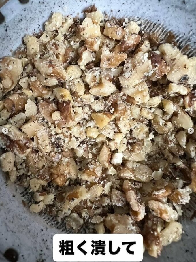 2枚目に「黒胡麻を擦り玄米小豆に入れます」として、入れた場所は下が見えなくなるくらいのしっかりした量の黒ごまを投入した写真を投稿。さらに3枚目と4枚目に胡桃の写真を投稿し、粗く割ったものを続けて投入するとしています。