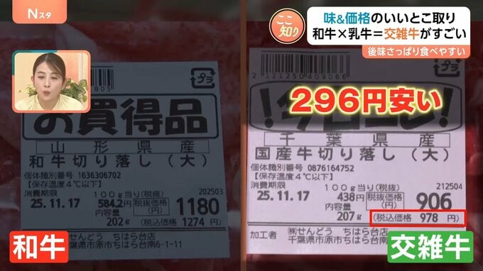 商品のお値段を見てみても、ほぼ同じグラムで和牛が1274円に対して、交雑牛が978円と、296円安く、1000円を切りました。