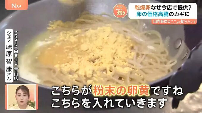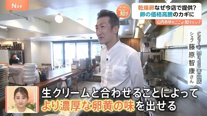 「通常の卵と変わらないような味なんですが、この粉末の卵黄に関しては、濃縮されていますので、生クリームと合わせることによって、より濃厚な卵黄の味を出せる」