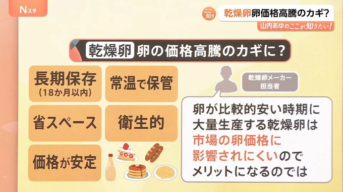 乾燥卵メーカーの担当者によりますと、「卵が比較的安い時期に大量生産する乾燥卵は、市場の卵価格に影響されにくいのでメリットになるのでは」としています。
