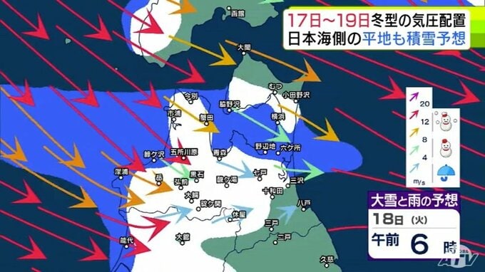 【大雪情報】東北地方の日本海側の山沿いを中心に「大雪」の恐れ 平地でも雪の積もる所があるか 週明け17日(月)~19日(水)頃にかけて冬型の気圧配置に 積雪・路面の凍結・交通障害に注意を