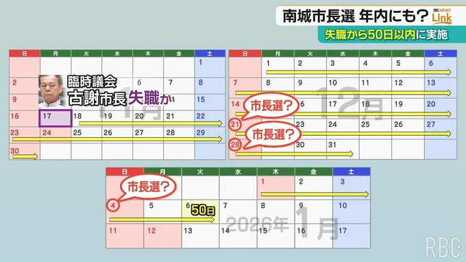 改選後初めての臨時議会が17日に開かれることが決まりました。ここで再度不信任決議案が提出されて可決し、古謝市長は失職する見通しです。その後、50日以内に市長選挙が実施されますが、失職の翌日から数えて1月6日が50日目となります。