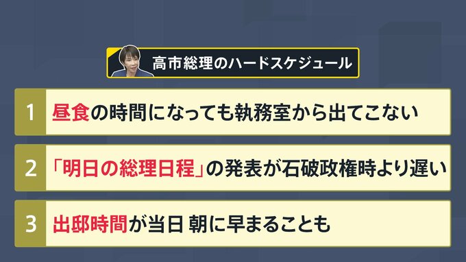 石破政権時には前日の午後7時頃には翌日の日程が発表されていたが、高市政権では午後10時を過ぎることも。予算委員会中だったこともあり、ギリギリまで答弁準備などの予定を調整をしているのでは、と記者は話す。