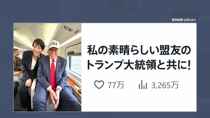 さらに印象的だったのは、トランプ大統領来日時の投稿だ。「私の素晴らしい盟友のトランプ大統領と共に!」という文章とあわせて、大統領専用ヘリ・マリーンワンでの一枚が投稿され、3200万回以上表示された。これは日米首脳会談の成功を象徴する写真となった。