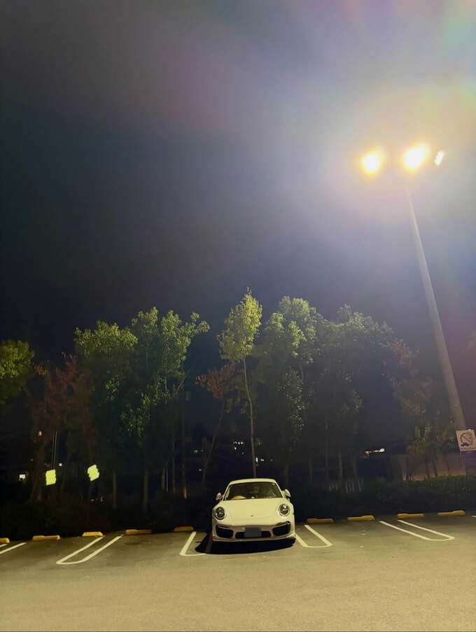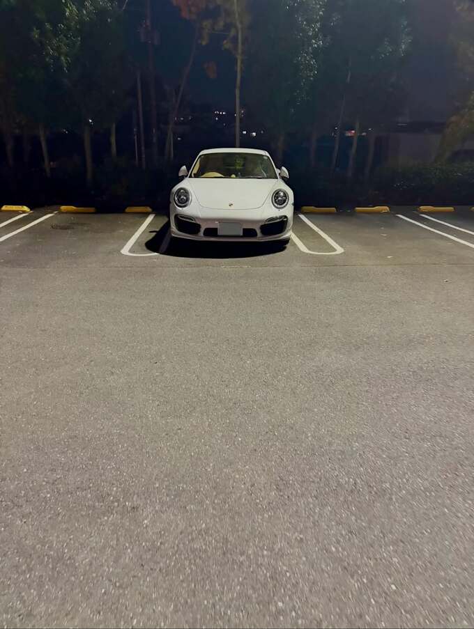 笹野さんが投稿したのは、白のポルシェ911の写真。すでに夜闇に包まれた駐車場で、遠くのグリッドに1台だけじっと佇んでいます。