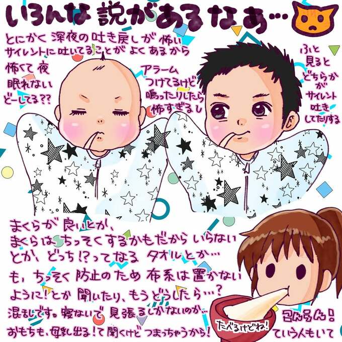 翔子さんは「サイレント吐き どうしてますか?」とフォロワーに問いかけ。乳児たちは気づかぬ間に嘔吐していることがあり、その吐瀉物が気管に詰まる危険もあるので目が離せないといいます。