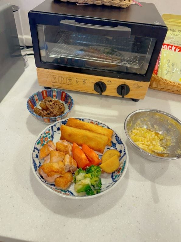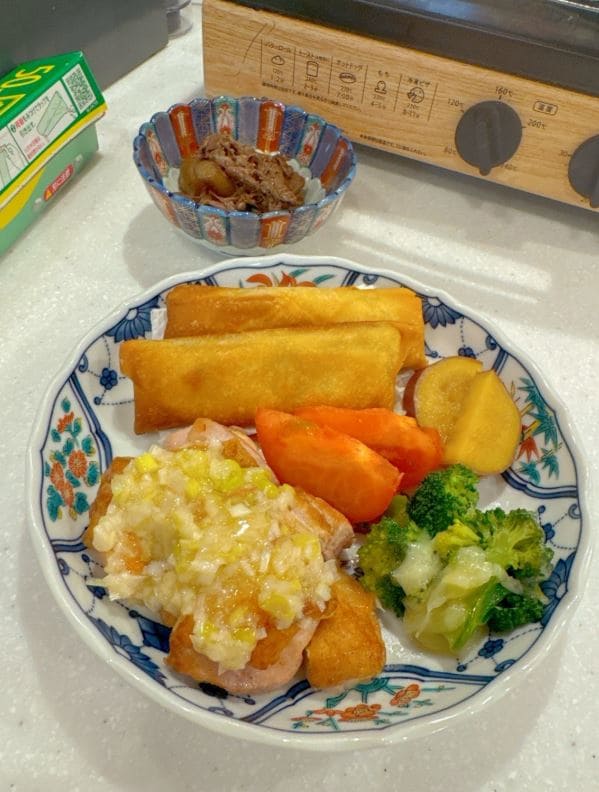 メニューは「最近子ども達が大好き」というネギダレのチキンをメインに、春巻きと、ニンジン、ブロッコリー、サツマイモが添えられています。
